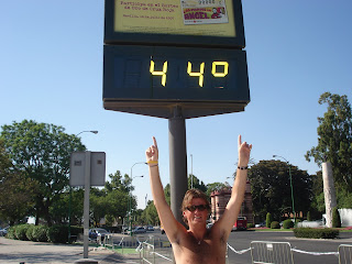 Si bien a lo largo de todo el palacio hay varios bebederos y fuentes de las cuales en todas parábamos a refrescarnos, al salir del mismo a las pocas cuadras tuvimos que comprar un agua mineral que duro 30 segundos. Si bien sentíamos a pleno el calor no sabíamos que temperatura hacia. Resignados y con paso lento, seguimos caminando porque era nuestro único día para conocer la ciudad. Caminamos 8 cuadras aprox. hasta llegar a Plaza España, una plaza semicircular enorme, que tiene un rió artificial y una fuente enorme en el medio donde mojamos la patas. La plaza fue construida para una muestra internacional en 1930, así que estaba hecha a todo trapo y sin dudas un lujo para la época. Cruzamos el parque Maria Luisa que esta enfrente de plaza España y tiene una reserva natural de pájaros y bajo la sombra de los árboles paramos a tomar un helado. Llegamos a Plaza de las Americas, donde se encuentra el Museo de Artes y Costumbres Populares, ahí vimos una interesante muestra sobre la guerra civil española en base a la cartografía usada en esa época. Si si, otra vez mas, nos culturizamos un poco! Al salir del museo entendimos porque nuestros cuerpos no paraban de transpirar. El cartel de la av. De las Delicias indicaba que a las 18.50 horas, hacia una temperatura de 44 grados!!!!
